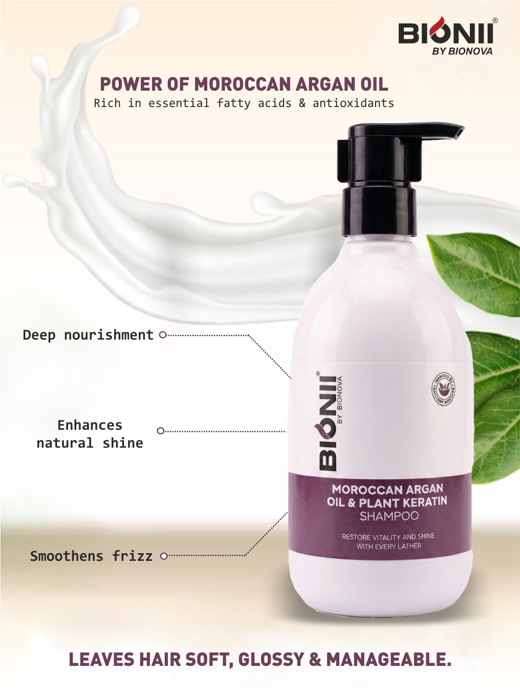 Infused with the richness of Moroccan beauty rituals, Bionii Moroccan Argan Oil & Plant Keratin Shampoo 300ml turns every wash into a nourishing experience. Its creamy lather gently cleanses while restoring lost vitality and natural shine. Moroccan Argan Oil deeply nourishes dry, dull hair, while Plant Keratin helps strengthen and smooth each strand. Enriched with Tulsi, Aloe Vera, and Amla extracts, this argan oil shampoo supports scalp comfort and hair resilience. With every lather, hair feels softer, shinier, and visibly healthier—crafted with care for quality-driven daily hair cleansing.