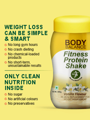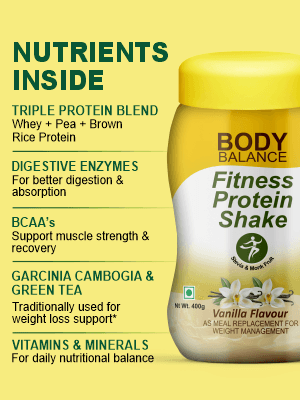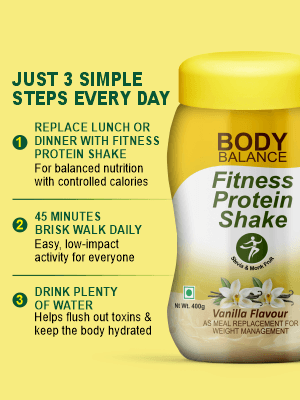 Every morning starts with a choice. With Body Balance Fitness Protein Shake, that choice becomes effortless. One creamy vanilla shake delivers balanced nutrition designed to replace a meal and support weight management. Smooth, lightly sweetened with stevia & monk fruit, it blends beautifully with milk for a satisfying, indulgent texture. Each serving provides 9 g protein, dietary fiber, probiotics, BCAAs, and essential vitamins and minerals to support energy and body balance. Crafted using a premium multi-protein blend and functional ingredients, this shake fits seamlessly into active, health-focused lifestyles — nourishing, filling, and delightfully easy to enjoy.